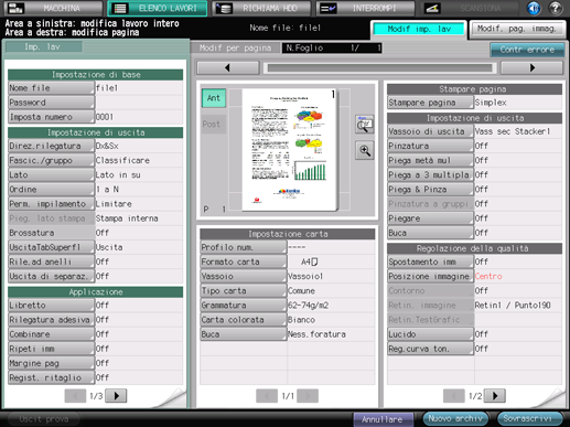 Modif imp. lav | Consente di verificare l'Impostazione di base, l'Impostazione di uscita, l'Impostazione Applicazione, l'Impostazione carta e la Regolazione qualità di un lavoro conservato o memorizzato nell'HDD e anche di modificarli parzialmente per l'emissione. |
