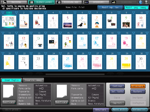 Modif. pag. immag. | Include l'anteprima delle immagini della pagina in sequenza. Questa funzione permette inoltre di inserire, spostare, o copiare le immagini o i fogli (copertine). |