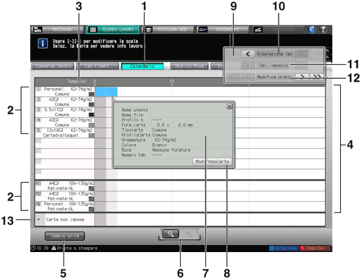 7 | Finestra di dialogo delle impostazioni carta | Appare quando è selezionata la visualizzazione della barra del lavoro. Fornisce un'impostazione carta dettagliata del lavoro selezionato. |