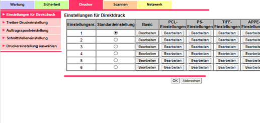 [Einstellungen für Direktdruck] | Es können 6 Muster für Standarddruckerdeinstellungen für den Direktdruck registriert werden. Die anhand der Optionsschaltfläche [Standardeinstellung] ausgewählten Einstellungen können unter [Informationen] - [Druckeinstellungen] angezeigt werden. Ausführliche Informationen finden Sie unter Einstellungen für Direktdruck. |