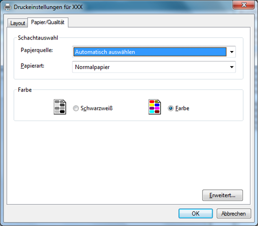 [Papierquelle] | [Automatisch auswählen], [Manuelle Zufuhr] | Wählen Sie ein Papierfach. |
