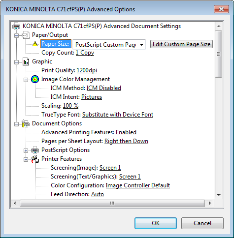 [Ausgabefarbe] | [Auto.Farbe], [Vollfarbe], [Graustufen] | Wenn [Auto.Farbe] ausgewählt ist, werden Bilder, die zu einfacher K-Farbe umgewandelt wurden, in Graustufen gedruckt. Bilder, die nach der Umwandlung Farben enthalten, werden dagegen in Farbe gedruckt. Beachten Sie, dass beim gleichzeitigen Drucken von Farb- und Monochrom-Dokumenten im Auto-Farbmodus die Umschaltung zwischen Farbe und Graustufen die Produktivität verringert. Wenn [Full Color] ausgewählt ist, werden alle Dokumente unabhängig vom Umwandlungsergebnis in Farbe gedruckt. Der Druck in Vollfarbe hat keine Auswirkungen auf die Produktivität, da keine Umschaltung zwischen Prozessen erforderlich ist. Wenn [Gray Scale] ausgewählt ist, werden alle Dokumente unabhängig vom Umwandlungsergebnis als Schwarzweiß-Dokumente gedruckt. Der Druck in Graustufen hat keine Auswirkungen auf die Produktivität, da keine Umschaltung zwischen Prozessen erforderlich ist. *Die Farbumwandlungsergebnisse variieren in Abhängigkeit von der Farbkonfiguration. |