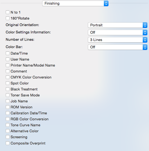 [Information zu Farbeinstellungen] | [Aus], [Links], [Oben], [Rechts], [Unten], [Druckerstandardwerte] | Legen Sie die Druckposition für die [Information zu Farbeinstellungen] fest. Verwenden Sie diese Funktion, wenn Sie beim derzeit ausgeführten Job die Uhrzeit und das Datum des Drucks drucken oder ein Profil für die Farbumwandlung verwenden usw. Ausführliche Informationen über die druckbaren Elemente finden Sie [Color Settings Information]. |