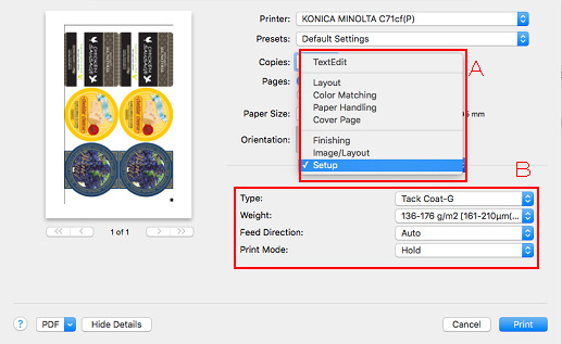 [Print Cover Page] | [None], [Before document], [After document] | Geben Sie an, ob Deckblattpapier gedruckt werden soll und wo die Deckblattseite einzufügen ist. |