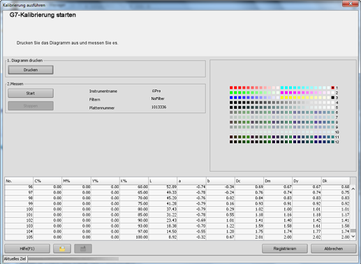 Der Diagrammdruck wird durchgeführt. Nach dem Druckvorgang wird wieder der Bildschirm für die G7-Kalibrierung angezeigt.