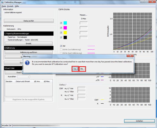 Klicken Sie auf [Ja], um den Bildschirm für die Ausführung der G7-Kalibrierung anzuzeigen.