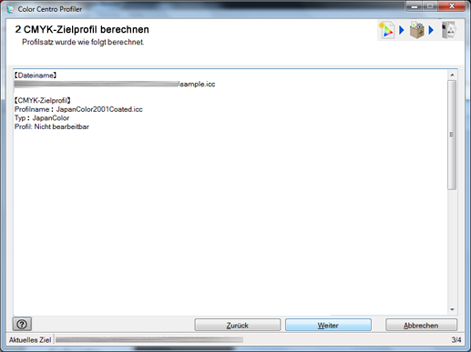 Im Bildschirm mit dem Berechnungsergebnis wird die Liste der Einstellungen des generierten CMYK-Zielprofils angezeigt.