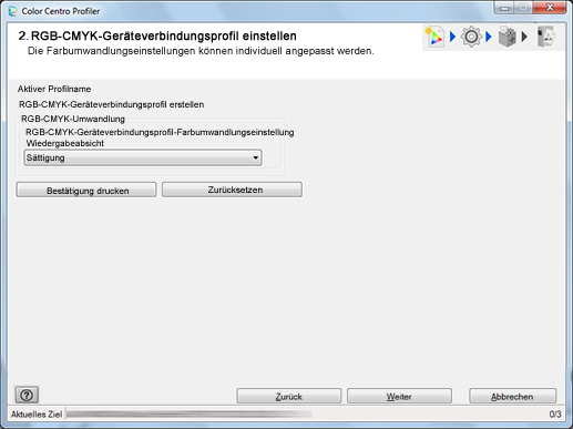 Wenn Sie auf [Abbrechen] klicken, wird der Bildschirm [Bestätigung drucken] geschlossen und der Bildschirm für die individuelle Anpassung der Farbumwandlung wird wieder angezeigt.