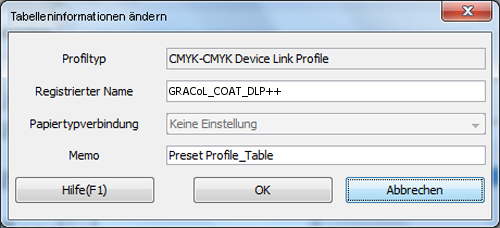 Der werksseitig vorregistrierte Tabellenname des CMYK-CMYK-Geräteverbindungsprofils kann jedoch nicht geändert werden.
