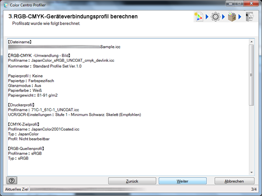 Im Bildschirm mit dem Berechnungsergebnis wird die Liste der Einstellungen des generierten Profilsatzes angezeigt.