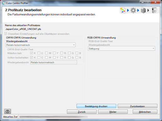Wenn Sie auf [Abbrechen] klicken, wird der Bildschirm [Bestätigung drucken] geschlossen und der Bildschirm für die individuelle Anpassung der Farbumwandlung wird wieder angezeigt.