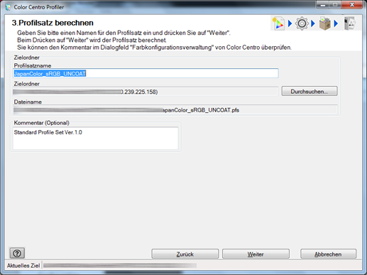 Geben Sie unter "Kommentar" einen Kommentar ein, der in den von Ihnen erstellten Profilsatz eingebettet werden soll, sofern erforderlich. Sie können den Kommentar prüfen, wenn Sie den Profilsatz in Color Centro Profiler auswählen.