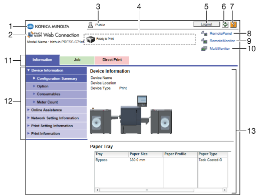 Nach der Anmeldung an PageScope Web Connection wird ein Bildschirm angezeigt, der so wie der unten dargestellte Bildschirm aufgebaut ist. Im Folgenden wird ein Beispiel des Bildschirms angezeigt, der nach Auswahl von [Geräteinformationen] im Register [Informationen] geöffnet wird.