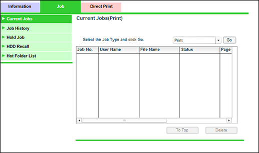 [Job halten] | Gehaltene Jobs können überprüft, auf der internen HDD gespeichert oder ausgedruckt werden. |