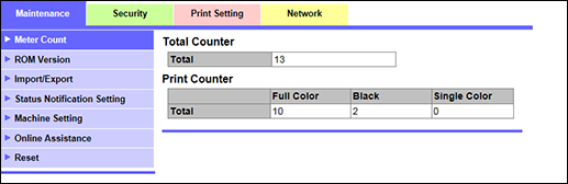 Klicken Sie auf [Verbrauchszählung] im Menü des Registers [Wartung], um diesen Bildschirm aufzurufen.