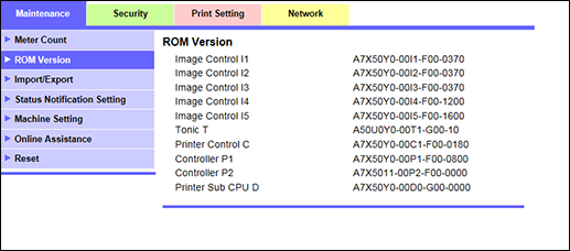 Klicken Sie auf [ROM-Version] im Menü des Registers [Wartung], um diesen Bildschirm aufzurufen.