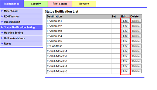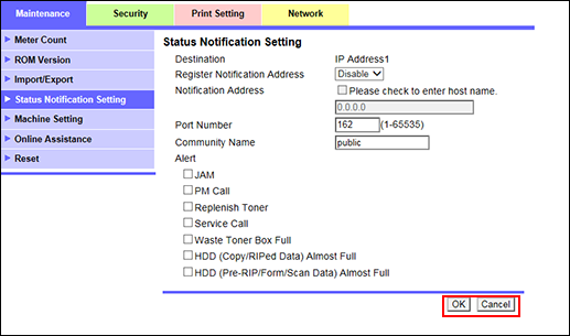 Klicken Sie auf [Benachrichtigung über Status] im Menü des Registers [Wartung], um diesen Bildschirm aufzurufen.