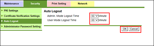 Wählen Sie in der Dropdown-Liste [Abmeldezeit für Administratormodus] eine Abmeldezeit aus. (1 Minute/2 Minuten/3 Minuten/4 Minuten/5 Minuten/6 Minuten/7 Minuten/8 Minuten/9 Minuten/10 Minuten/20 Minuten/30 Minuten/40 Minuten/50 Minuten/60 Minuten)