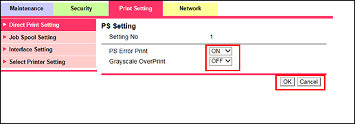 Wählen Sie [EIN] oder [AUS] in der Dropdown-Liste [PS-Druckfehler] sowie [EIN] oder [AUS] in der Dropdown-Liste [Graustufen-Überdruck].