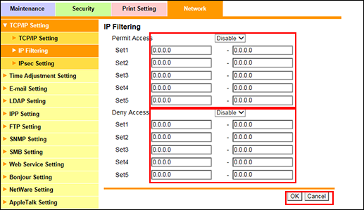 Klicken Sie auf [TCP/IP] - [IP-Filterung] im Register [Netzwerk], um diesen Bildschirm anzuzeigen.