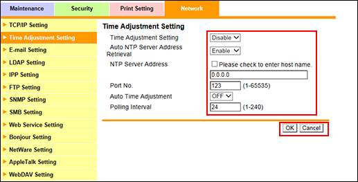 Klicken Sie auf [Zeiteinstellung] im Menü des Registers [Netzwerk], um diesen Bildschirm aufzurufen.