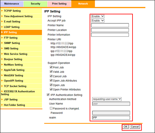 Zur Verwendung der IPP-Einstellung wählen Sie in der Dropdown-Liste [IPP] und [IPP-Job annehmen] den Eintrag [Aktivieren].
