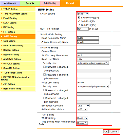Zum Senden eines Traps bei einem Authentifizierungsfehler wählen Sie in der Dropdown-Liste [TRAP-Einstellung bei Authentication-Fehler] den Eintrag [Aktivieren].