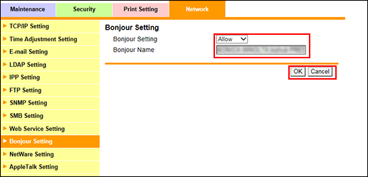 Die Inhalte der Einstellungen sind mit den Einstellungen identisch, die über [Netzwerkeinstellung] - [NIC-Einstellung] - [Bonjour-Einstellung] in der Administratoreinstellung aufgerufen werden können.