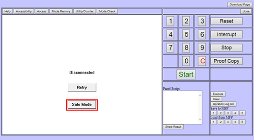 Das Real-time Remote Panel kann nicht gleichzeitig über zwei Computer oder mobile Endgeräte genutzt werden. Beim Zugriff über das zweite Gerät wird im Bereich des Touch Displays am Remote-Bedienpult ein Fehlerbildschirm angezeigt. Klicken Sie in dem Fall im Fehlerbildschirm auf [Abgesicherter Modus], um die Anzeige zum regulären Remote-Bedienpult umzuschalten.