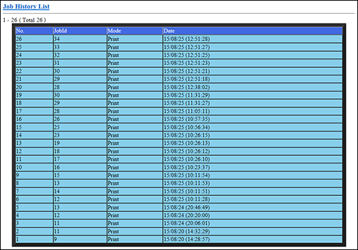 In der Liste werden die Verlaufsnummer (No.), die Auftragsnummer (JobId), der Modus (Mode) und das Datum der Auftragsausführung (Date) aufgeführt.