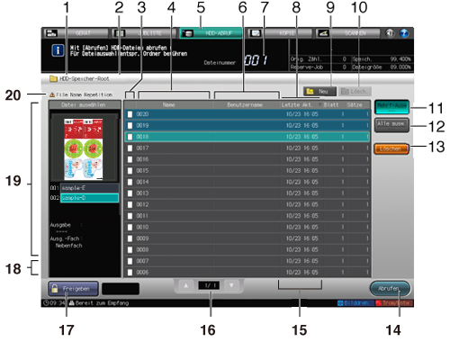 19 | Ausgewählte Datei | Zeigt ein Vorschaubild und die Ausgabeparameter des Auftrags an, der in der Liste der auf der Festplatte gespeicherten Aufträge ausgewählt ist. Ein kennwortgeschützter Auftrag kann nur angezeigt werden, wenn seine Sperre aufgehoben wurde. Wenn mehrere Aufträge, die auf der HDD gespeichert sind, ausgewählt sind, wird eine Liste dieser Aufträge angezeigt. |