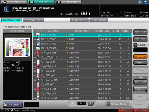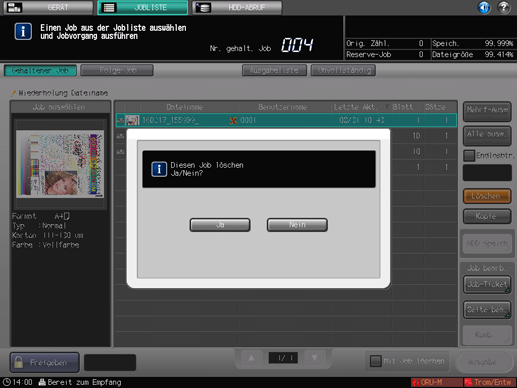 Drücken Sie auf das Register [JOBLISTE], um den Bildschirm [JOBLISTE] anzuzeigen.