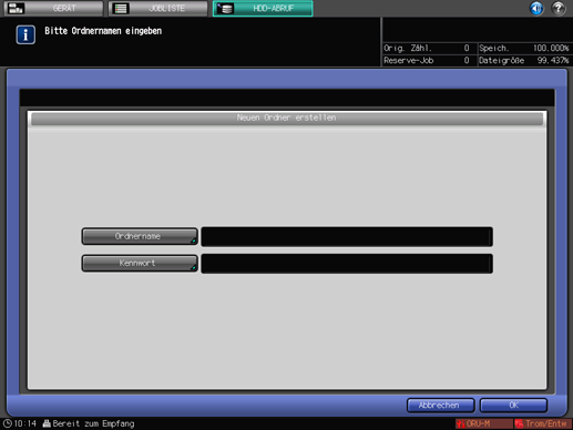 Wenn Sie einen neuen Ordner erstellen möchten, drücken Sie auf [Neu]. Der Bildschirm [Neuen Ordner erstellen] wird angezeigt. Geben Sie einen Ordnernamen und ein Kennwort ein und drücken Sie dann auf [OK]. Die Kennworteingabe ist nicht zwingend erforderlich. Der erstellte Ordner wird als leere Liste im Bildschirm dargestellt.
