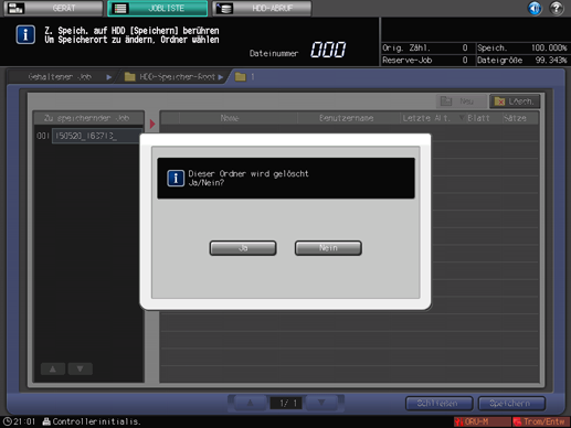 Wenn kein Job im Ordner gespeichert ist, können Sie den Ordner löschen, indem Sie auf [Löschen] drücken. Das Bestätigungsdialogfeld wird angezeigt. Drücken Sie auf [Ja], um den Löschvorgang durchzuführen, oder auf [Nein], um den Vorgang abzubrechen.