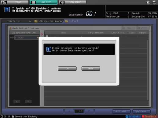 Wenn der Dateiname des Auftrags bereits vorhanden ist, wird ein Bestätigungsdialogfeld angezeigt. Drücken Sie auf [Ja], um den Speichervorgang durchzuführen, oder auf [Nein], um den Vorgang abzubrechen.