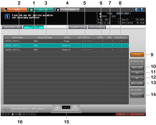 15 | Blättertasten | Werden verwendet, um durch die Liste der Folge-Jobs zu blättern. Die aktuelle Seitennummer und die Gesamtseitenanzahl der Liste werden zwischen den Tasten angezeigt. |