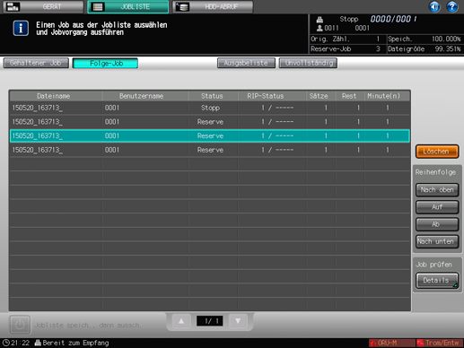 Im Bildschirm [Folge-Job] des Registers [JOBLISTE] wird der aktuelle Status der derzeit aktiven Druckaufträge, der zurückgestellten Aufträgen oder der Folge-Jobs in Listenform angezeigt.
