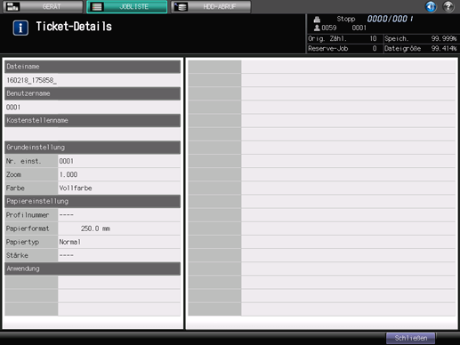 Sie können aktive Druckaufträge oder zurückgestellte Aufträge in diesem Bildschirm löschen und die Details dieser Aufträge im Bildschirm [Ticket-Details] abrufen.