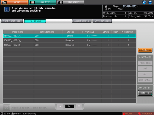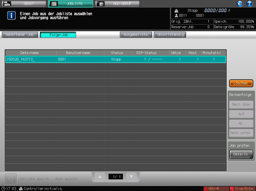 Drücken Sie während der Ausgabe im Bildschirm [GERÄT] auf das Register [JOBLISTE].
