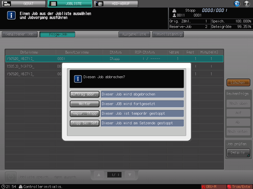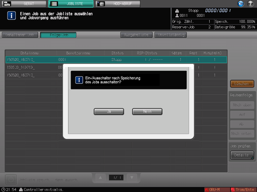 Drücken Sie auf [Nein], um die Fortsetzung der Aufträge am nächsten Tag abzubrechen. Der Bildschirm [JOBLISTE] wird wieder angezeigt.