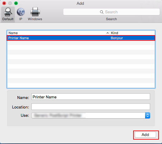Wählen Sie in der Liste [Printer Name] den Namen des gewünschten, per Bonjour verbundenen Modells aus.