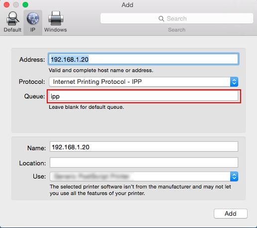 Geben Sie unter [Address:] die IP-Adresse des Systems ein. Geben Sie unter [Queue] die Zeichenfolge "ipp" ein.