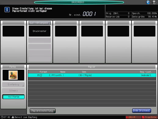 Wenn die Einstellungen von den Spezifikationen des derzeit eingelegten Mediums abweichen, drücken Sie auf [Papiereinstellung] und dann auf [Abrufen] oder [Einst. änd.], um die Papiereinstellungen zu ändern.