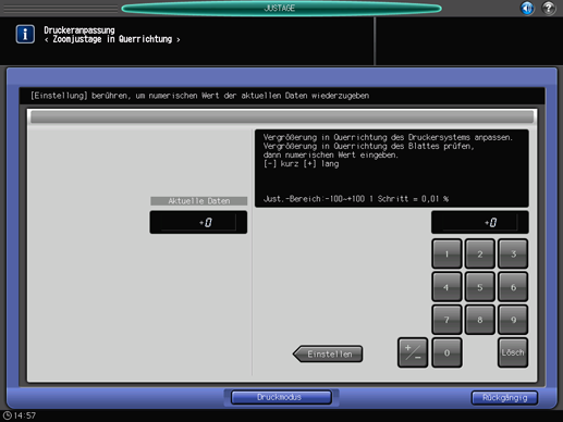 Wenn eine Justage erforderlich ist, drücken Sie auf [Ende Druckmod.], um zum Bildschirm [Vergröß.jus. Querrichtung] zurückzukehren.