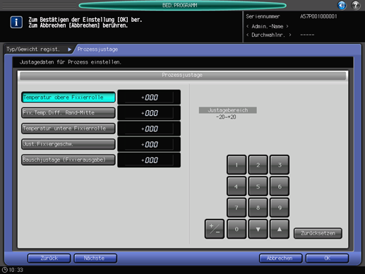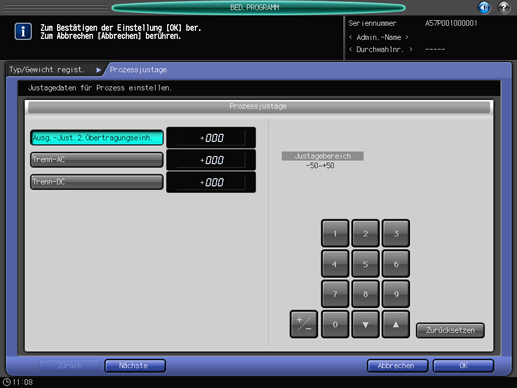Prozessjustage | Prozessjustage für Transfer/Trennung/Fixierung und Fixier-Anfangstemp. Auf, Tonermenge Sparen, Dichtejust./Pap (YMC), Dichtejust./Pap. (K), Fehlzentrierungsstauerk., Dick Schwarz-Modus, Luft für Fixierlufttrennung einstellen, Änderung Fixierdruck können angepasst werden. Ausführliche Informationen über die Fehlzentrierungsstauerkennung finden Sie Staueinstellung Druckjob: Einrichten der Erkennung von Papierstaus durch eine Fehlausrichtung. [Prozessjustage] wird nicht standardmäßig angezeigt. Wenden Sie sich an den Servicetechniker. | Ausg.-Just. 2 Übertragungseinh.: -50 bis +50 Trenn-AC: -600 bis +600 Trenn-DC: -60 bis +60 Temperatur obere Fixierrolle: -20 bis +20 Fix.Temp.Diff. Rand-Mitte: -10 bis +10 Temperatur untere Fixierrolle: -15 bis +10 Just.Fixiergeschw.: -200 bis +200 Bauschjustage (Fixierausgabe): -20 bis +20 Fixier-Anfangstemp. Auf: Auto, Aus Tonermenge Sparen: Ein, Aus Dichtejust./Pap. (YMC): 0 (Normal), +1, +2, +3 (Max.) Dichtejust./Pap. (K): 0 (Normal), +1, +2, +3 (Max.) Fehlzentrierungsstauerk.: Erkennen, Nicht erkennen Dick Schwarz-Modus: Ein, Aus Luft für Fixierlufttrennung einstellen: 1 (Schwach) bis 7 (Stark), Auto (3) Änderung Fixierdruck: Auto, Normal, Schwach |