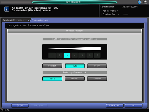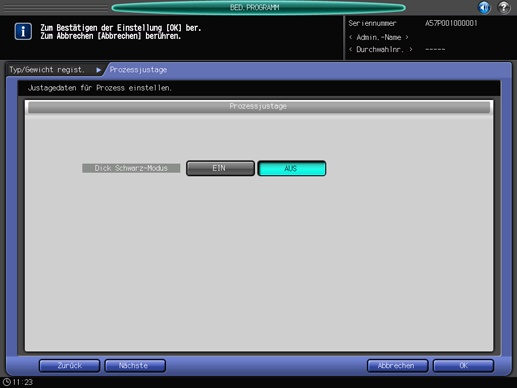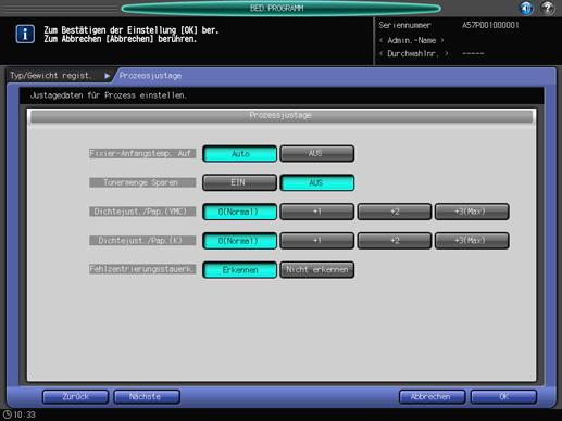 "Prozessjustage" wird nicht standardmäßig angezeigt. Wenn Sie die Prozessjustage in der Papiereinstellung verwenden möchten, wenden Sie sich an den Servicetechniker.