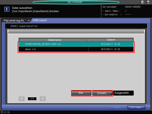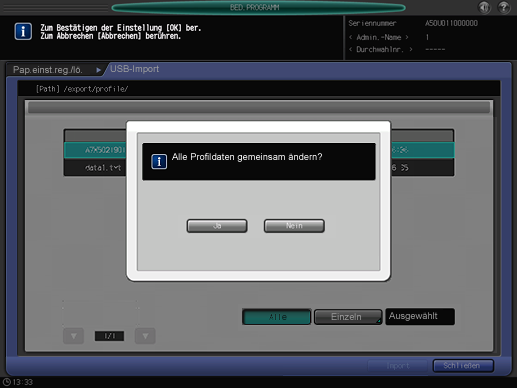 Bei Auswahl der Option [Alle] werden alle Papiereinstellungsdaten, die auf dem USB-Flash-Laufwerk gespeichert sind, importiert. Die im System registrierten Daten werden dabei überschrieben.