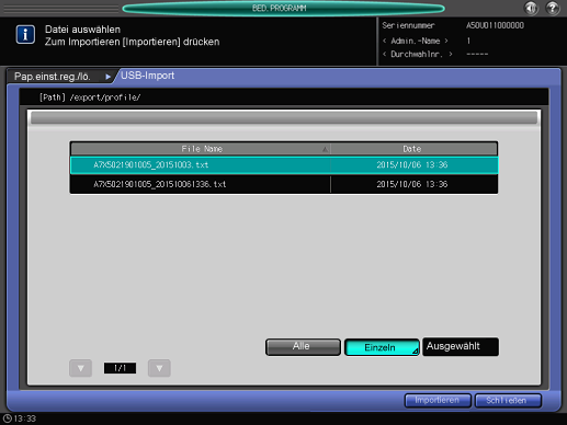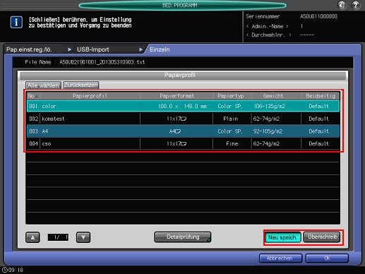 Wenn Sie die Option [Einzeln] wählen, werden die Papiereinstellungsdaten importiert. Die Daten werden neu auf dem System angelegt oder es werden vorhandene Daten auf dem Computer überschrieben. Mit der Option [Neu speich.] können bis zu 500 Datenelemente zusammen mit den Daten, die bereits auf dem System registriert wurden, importiert werden. (Die Datenelemente, die nach Abzug der registrierten Daten von 500 Elementen verbleiben, können importiert werden.) Mit der Option [Überschreib.] können bis zu 500 Datenelemente importiert werden.
