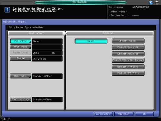Drücken Sie auf [OK], um die Einstellung abzuschließen. Wenn Sie die Änderung abbrechen möchten, drücken Sie auf [Abbrechen]. In beiden Fällen wird wieder der Bildschirm [Typ/Gewicht regist.] angezeigt.