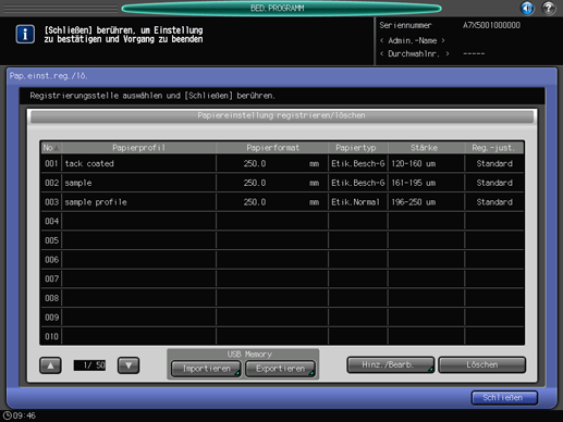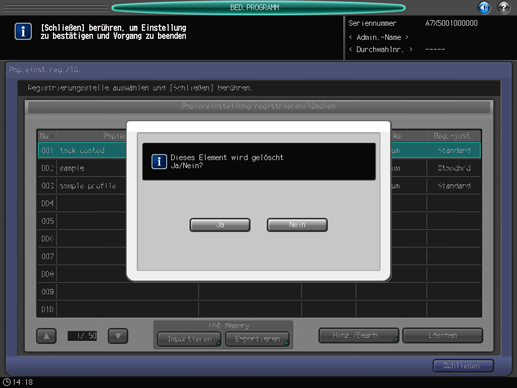 Wählen Sie die Zeile, die aus der Liste der Papierparameter gelöscht werden soll, und drücken Sie dann auf [Löschen].